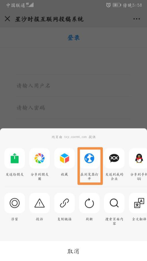 (4)用户可进入“星沙时报”微信公众号,点击底部菜单栏“在线投稿”按钮进入投稿页面。安卓手机请点击右上角,选择“在浏览器打开”。苹果手机可直接使用。