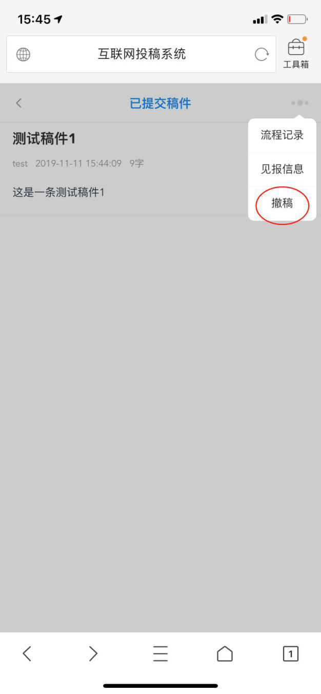 点击界面中的“撤稿”按钮,如果编审人员还没有对稿件进行审核或者送稿等操作,就可以将该稿件撤回到自己的草稿箱,如果编审人员已经做了审核或送稿操作,就会撤回失败。成功撤稿以后,稿件进入草稿箱,进入草稿箱,可以对稿件进行修改和提交操作。
