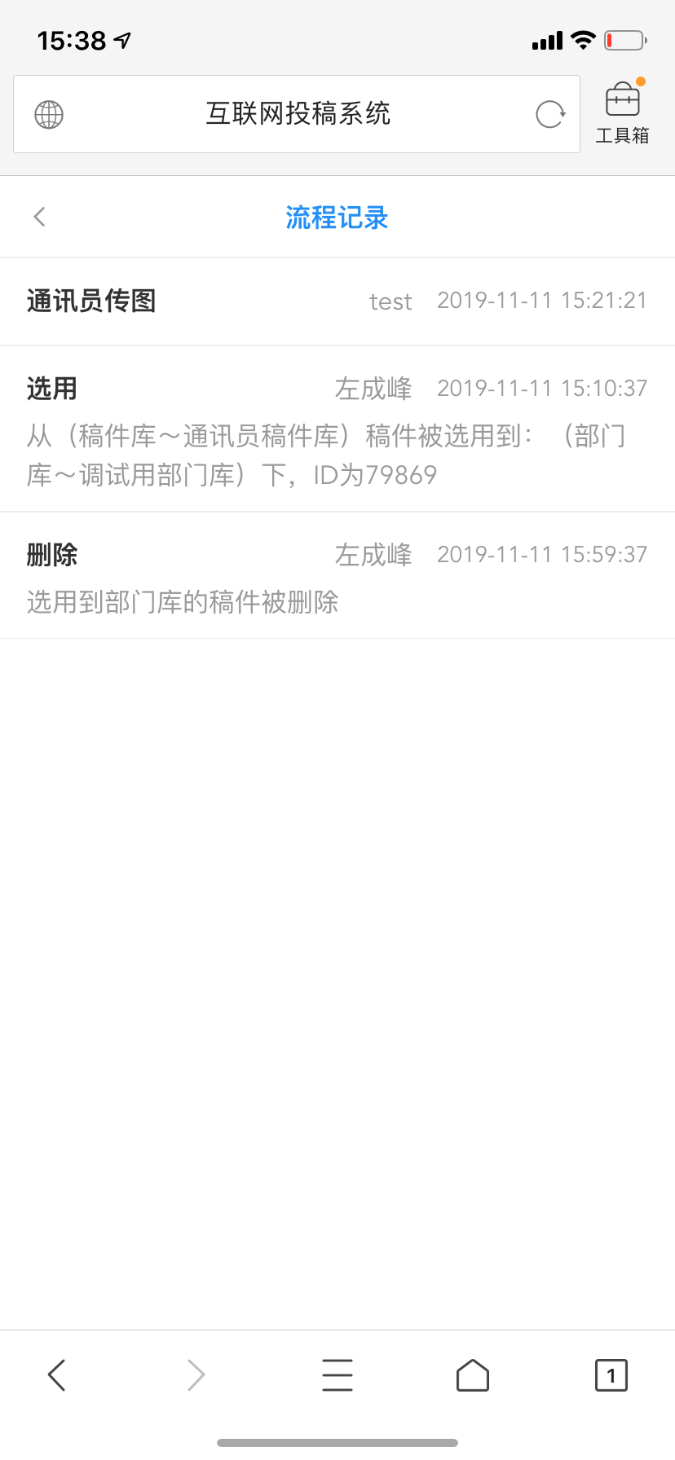 当被选用到部门库的稿件被删除后,会在通讯员稿件的流程记录中增加一条“选用稿被删除”的记录,如下图所示: