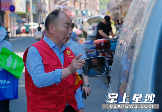 长沙县湘龙街道潇湘路社区65岁的骆兴旺戴上红袖章,穿上红马甲,在家门口的道路上劝导文明停车。章帝 摄