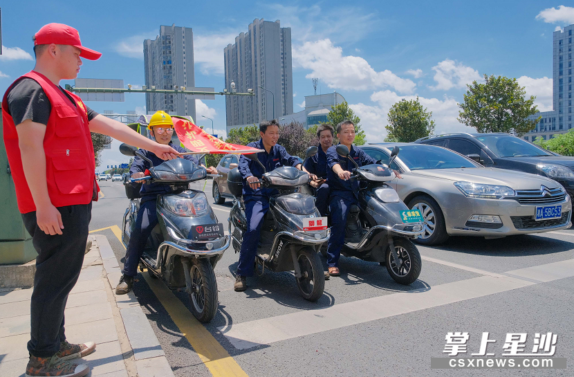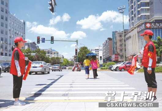 共青团长沙县委组织的青年志愿者参与文明创建志愿活动,每天在星沙大道与三一路交会处进行文明引导。章帝 摄