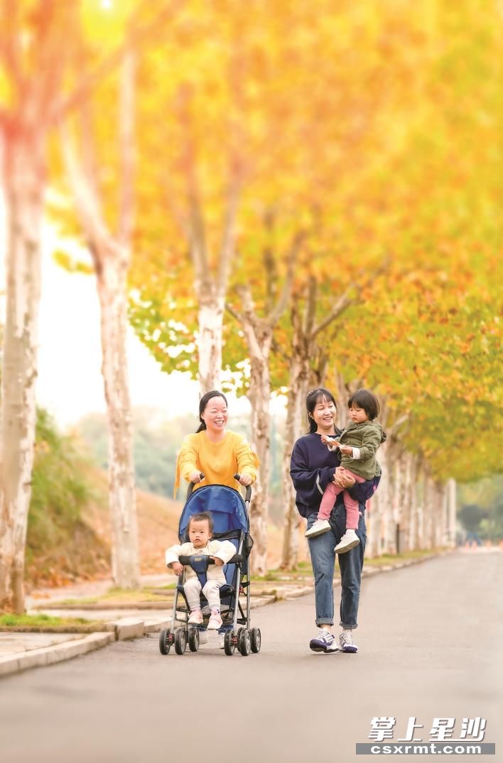 初冬时节,长沙县东六路旁的梧桐树变得金黄,市民正在悠闲地散步赏景。