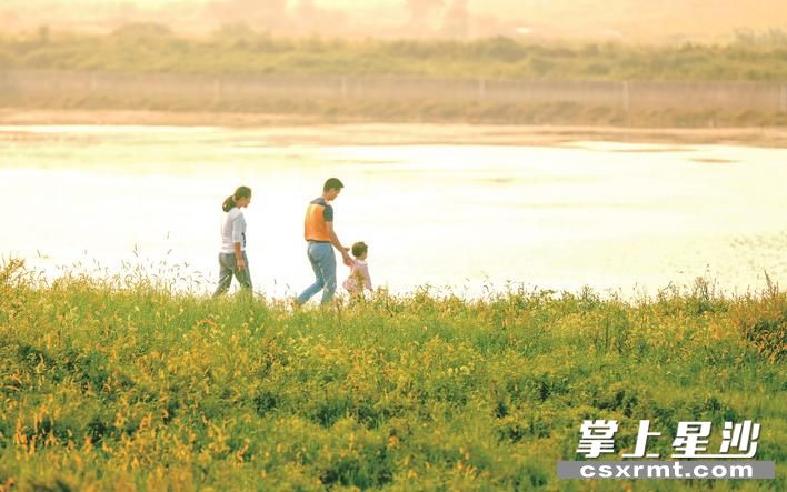 风景优美的松雅湖畔,星沙市民一家人在悠闲散步。