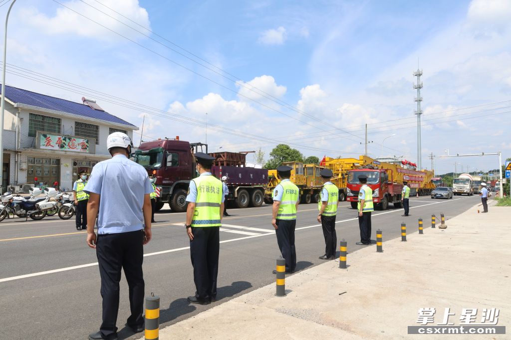 为了确保特高压变压器在长沙县运输过程中的交通安全,长沙县行政执法局在接到通知后,局领导高度重视,组织形成保障方案,提前踏勘运输线路,共抽调了15名执法队员和4台执法车辆参与全程押运护送任务,星沙、长龙、黄花、春华、安沙5个属地执法队作为机动队,在部分路段进行支援,提前撤走水马设置、通知沿线道路施工方避让。