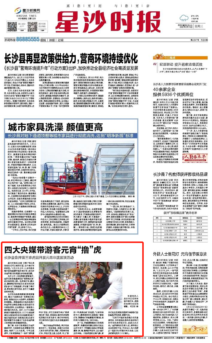 当天的央视新闻频道《新闻直播间》,播出了《湖南长沙 百虎闹元宵》新闻,展现红红火火迎虎年、庆新春的热闹景象。虎园里萌态尽显的老虎们和金井本土特色非遗文化项目在节目中登场亮相,让全国观众一睹绿茶小镇的魅力和风采。此外,CCTV4国际频道《中国新闻》栏目、CCTV2财经频道《正点财经》《经济信息联播》栏目及《央视新闻》客户端《天涯共此时 四海闹元宵》元宵节特别直播节目也播出了长沙县金井镇三珍虎园元宵非遗展演活动。