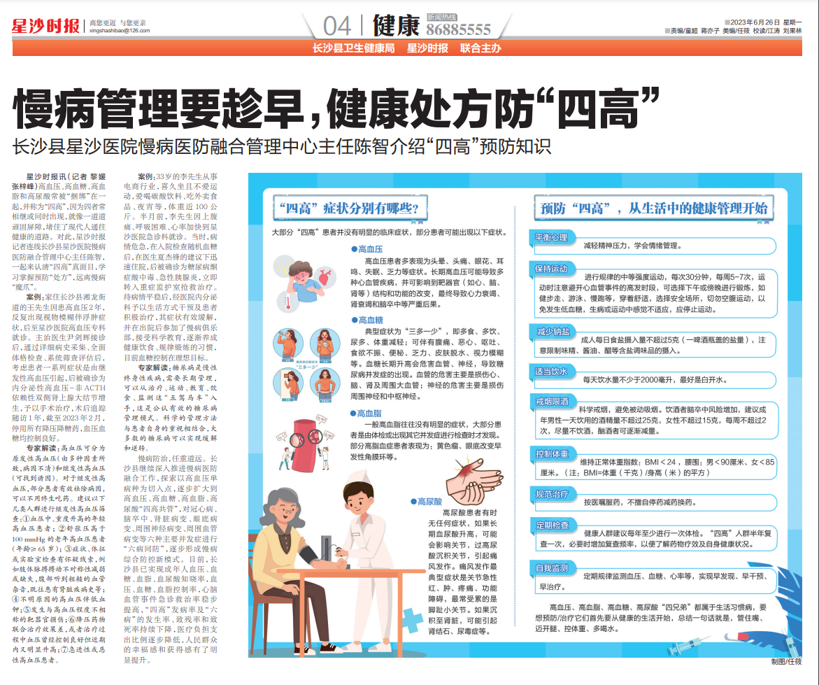 星沙时报6月26日讯(记者 黎媛 张梓峰)高血压、高血糖、高血脂和高尿酸常被“捆绑”在一起,并称为“四高”,因为四者常相继或同时出现,就像一道道顽固屏障,堵住了现代人通往健康的道路。对此,星沙时报记者连线长沙县星沙医院慢病医防融合管理中心主任陈智,一起来认清“四高”真面目,学习掌握预防“处方”,远离慢病“魔爪”。