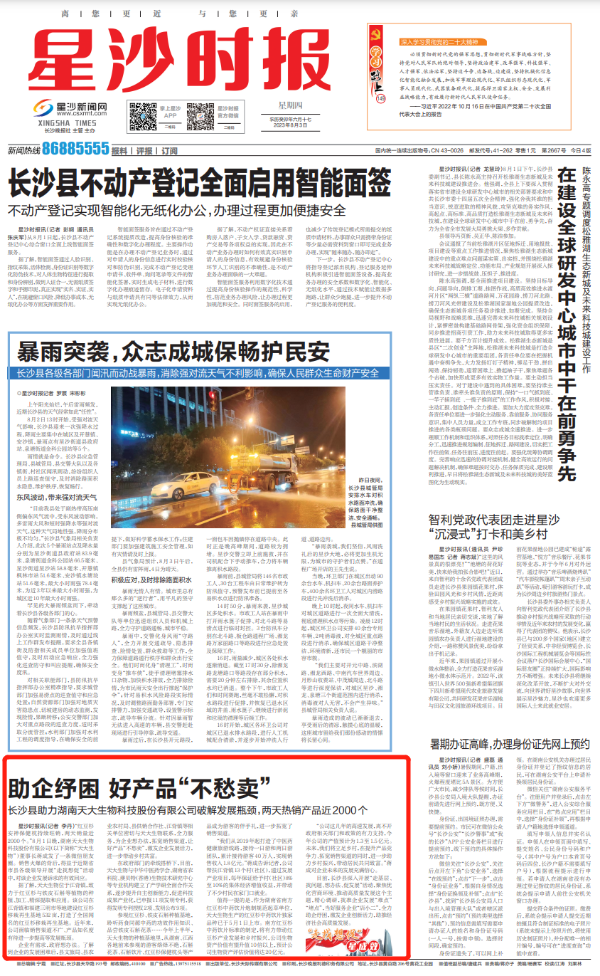 星沙时报8月2日讯(记者 李丹)“红豆杉安神保健枕持续旺销,两天销量近2000个。”8月1日晚,湖南天大生物科技股份有限公司(以下简称“天大生物”)董事长蒋成发了一条微信朋友圈。销售火爆的背后,得益于近期省市县各级领导开展“走找想促”活动中,对该企业发展诉求的有效回应。