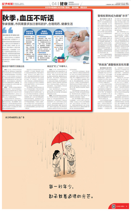 高血压是影响人们健康的常见慢性疾病,也是脑卒中、心脏病和肾病发病的重要危险因素。记者从长沙市中医医院(长沙市第八医院)了解到,进入秋季,在门急诊患者中,高血压患者明显增加。专家提醒广大市民,气温影响血管的收缩,在气温较低时,血管受到低温的刺激就会收缩,血液流动的阻力增加,导致血压升高,市民需要多加注意和防护,在医嘱下合理用药,健康生活。