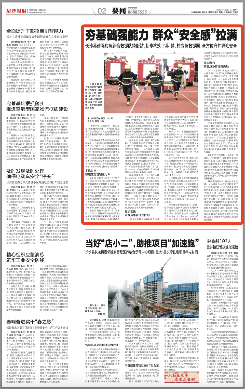 2024年是新中国成立75周年,也是实现“十四五”规划目标任务的关键一年,做好应急管理工作责任重大、任务艰巨。长沙县综合应急救援队将进一步强化队伍标准化建设。强化党对基层应急管理工作的领导,根据各镇街人口数量、经济规模、灾害事故特点、安全风险程度等因素,进一步加大财力保障,合理配齐配强应急救援力量,按照“3个综合基地+13个救援站”规划,加大队伍标准化建设,按标准配置相应的业务用房、办公室、备勤室等功能性用房和训练设施、训练场地,并进一步完善配套的救援车辆及救援器械等,满足各类应急救援任务处置需求,确保突发事件发生后在最短时间到达现场,最大程度降低损失。