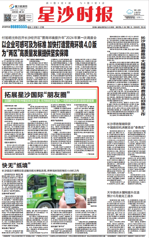 “此次伯努瓦·迪戎率团来访,将是两地友好交往新的起点,希望两地持续深化交流交往,手牵手、肩并肩,谋发展、促合作、图共赢。”来访当天,长沙经开区党工委书记、长沙县委书记付旭明与考察团交流座谈时表示,期待双方增进友好交往,共同维护和巩固双方的良好发展势头,推动两地人文交流、友好交往常态长效,着力打造中欧、中法友城交往标杆。