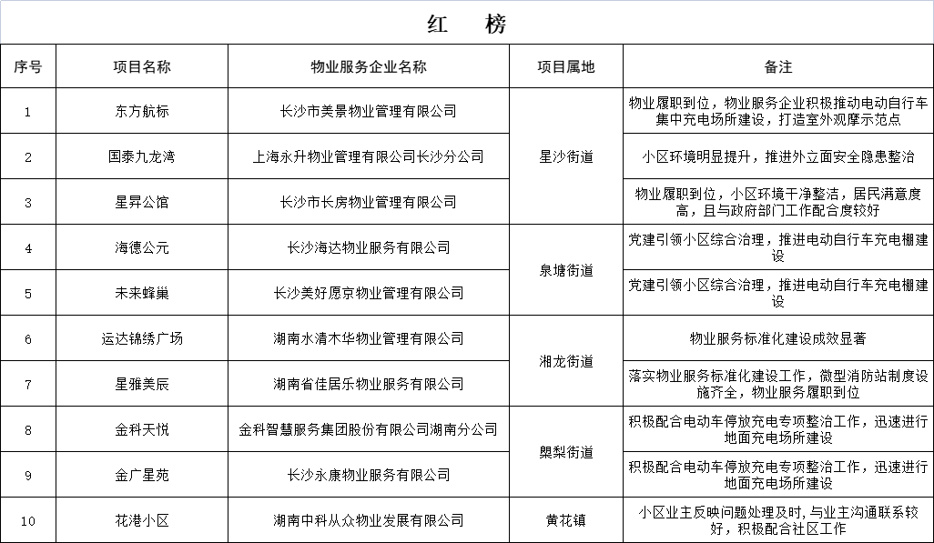 记者了解到,此次列入“红榜”的10家物业企业,是推进“红色物业”创建、物业服务标准化建设、安全隐患排查整治、文明城市建设等工作中表现突出的物业企业。比如,长沙市美景物业管理有限公司的东方航标小区,物业履职到位,物业服务企业积极推动电动自行车集中充电场所建设,打造室外观摩示范点;长沙海达物业服务有限公司的海德公园小区,党建引领小区综合治理,推进电动自行车充电棚建设;湖南水清木华物业管理有限公司的运达锦绣广场小区,物业服务标准化建设成效显著。