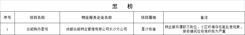 列入“黑榜”的1家物业企业,成都合能物业管理有限公司长沙分公司的合能枫丹星悦小区,物业服务履职不到位,小区环境存在脏乱差现象,装修建筑垃圾堆积极为严重。