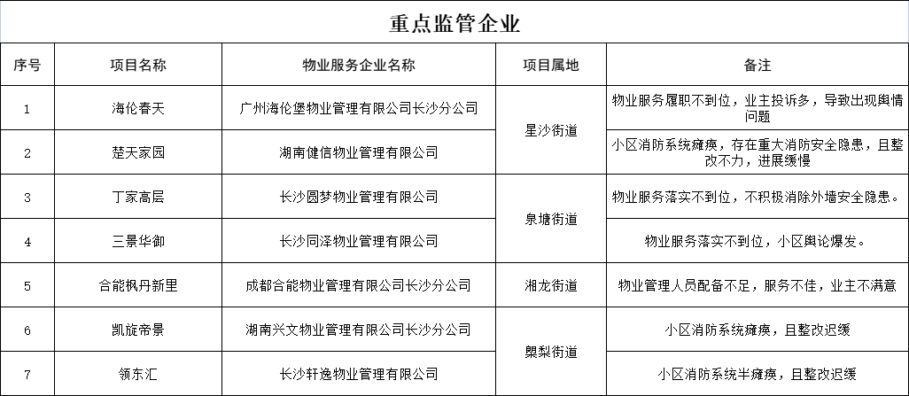 此外,广州海伦堡物业管理有限公司长沙分公司、湖南健信物业管理有限公司等7家物业企业被列入“重点监管”范围,行业主管部门和相关镇(街)将加大对其本县范围内的所有项目检查频次,对其法定代表人或者驻县负责人进行提醒、约谈、告诫,及时跟进矛盾纠纷投诉处理结果,督促物业服务企业规范服务。