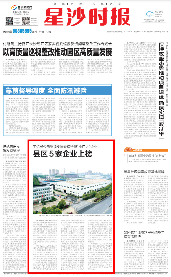 星沙时报6月26日讯(记者 李丹)中央财政资金进一步支持专精特新中小企业高质量发展。日前,工信部网站发布《关于财政支持专精特新中小企业高质量发展第一批第二年、第二批第二年和第三批第一年绩效评价结果的公示》,县区共有长沙韶光芯材科技有限公司、湖南顶立科技股份有限公司、湖南耐普泵业股份有限公司、长沙天恒测控技术有限公司、湖南中大创远数控装备有限公司5家企业上榜。