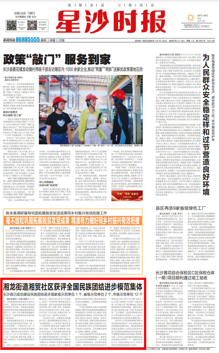 星沙时报9月27日讯(记者 杨源)9月27日,全国民族团结进步表彰大会在北京举行,表彰近年来以铸牢中华民族共同体意识为主线,为我国民族团结进步事业作出突出贡献的模范集体和模范个人。其中,长沙县湘龙街道湘贸社区作为“全国民族团结进步模范集体”接受表彰。