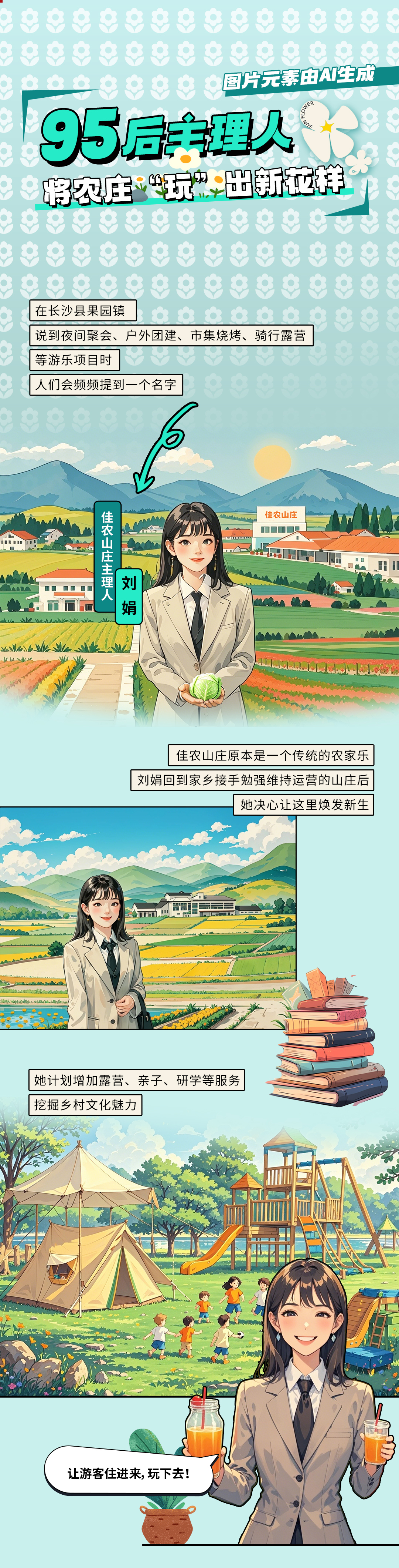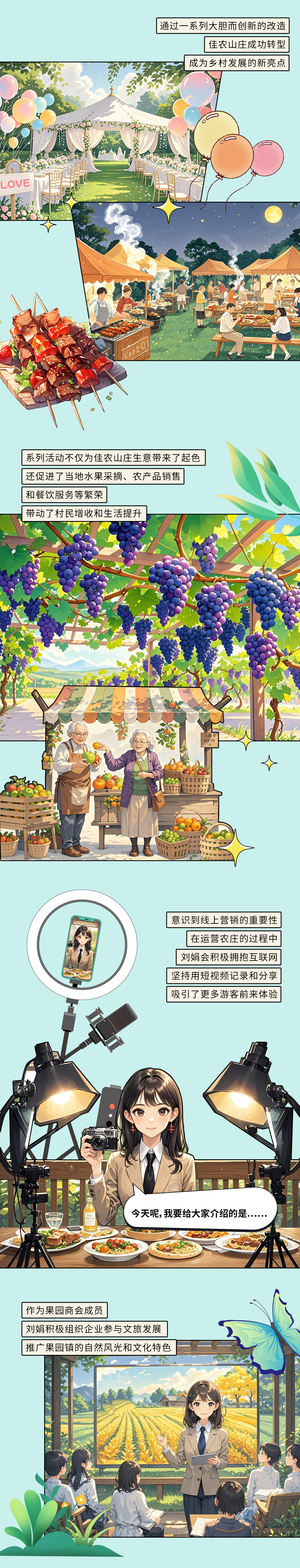 第七期,我们聚焦佳农山庄主理人刘娟。从2023年初回到果园镇扎根创业,接手了佳农山庄,成为一名农庄主理人,到如今,凭借满腔热情与活跃的思维,刘娟一点点在农庄里勾勒布局自己的梦想,这名95后的年轻创业者,在乡村找到了梦想的新方向,踏上了事业的新征程。让我们通过漫画,一起来看她的故事。