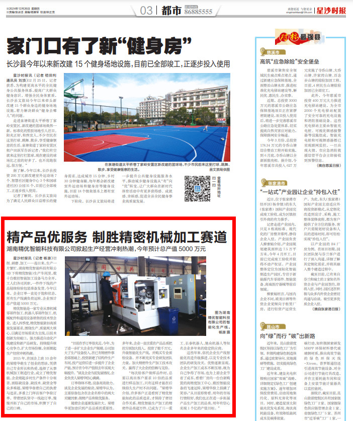 星沙时报12月26日讯(记者 杨源)切削、研磨、加工……连日来,生产一片繁忙。湖南精优智能科技有限公司(下称精优智能)生产车间里,数十台数控智能加工设备马力全开,工人们各司其职,一件件下线的产品陆续检验包装准备发货。今年以来,企业订单一直处于饱和状态,所有生产线满负荷运转,企业预计总产值超5000万元。