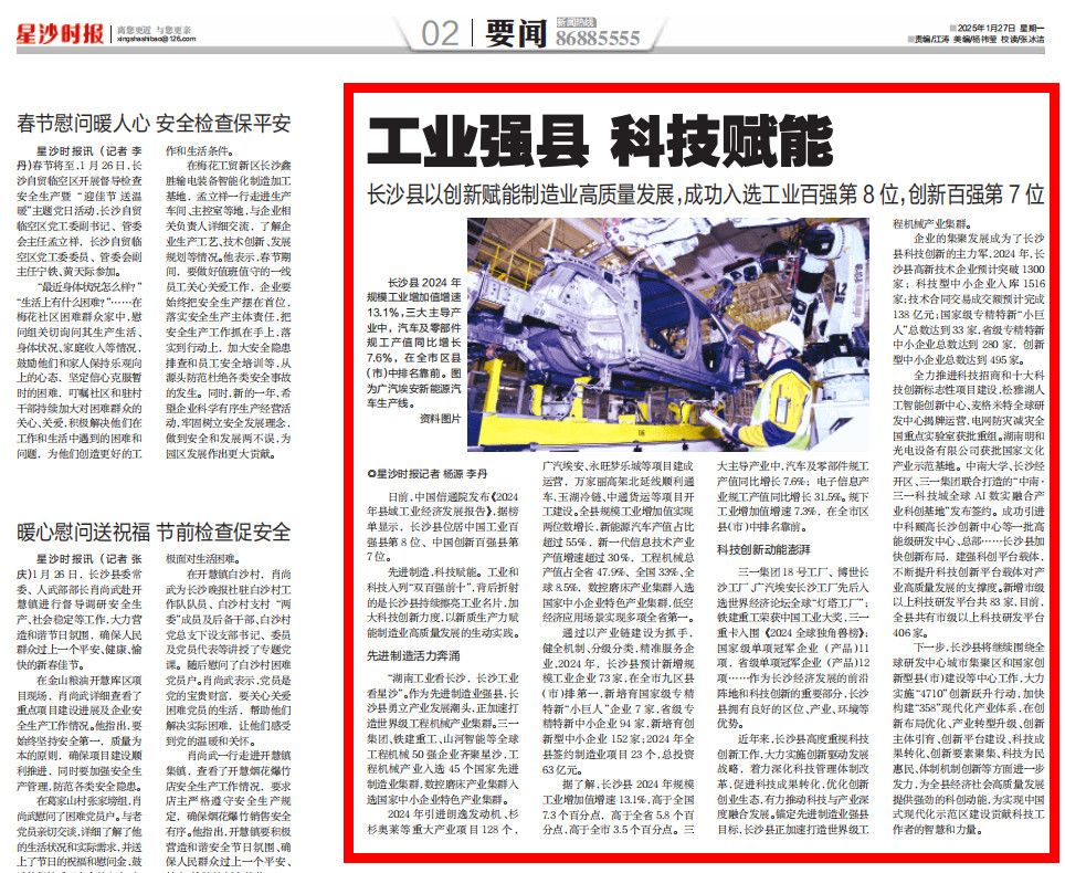 日前,中国信通院发布《2024年县域工业经济发展报告》,据榜单显示,长沙县位居中国工业百强县第8位、中国创新百强县第7位。