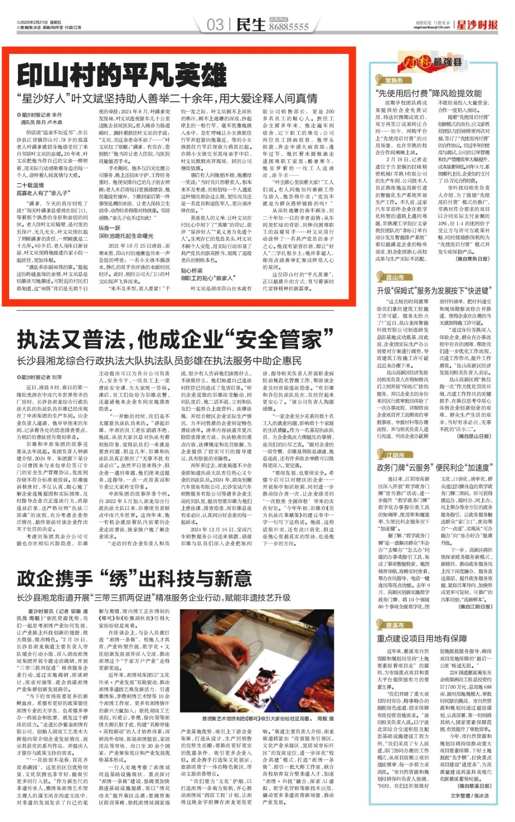 英勇救人的义举,让叶文斌在村民心中刻下了“英雄”的印记,获评“星沙好人”“见义勇为先进个人”。生死存亡的危急关头,叶文斌不顾个人安危,用实际行动彰显了共产党员的崇高担当,展现了退役老兵的钢铁本色。