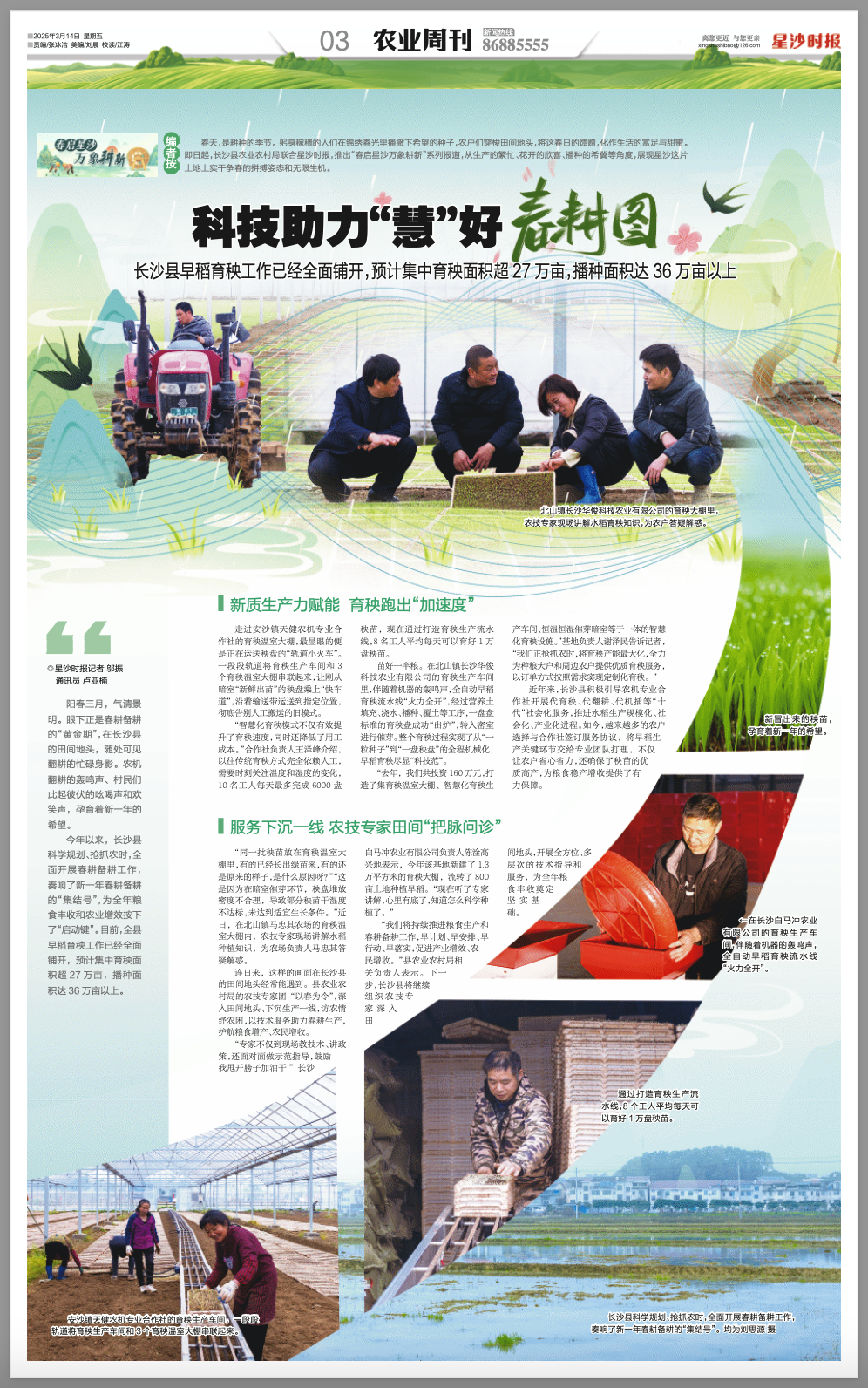 编者按:春天,是耕种的季节,亦是丰收的时节。躬身稼穑的人们在锦绣春光里播撒下希望的种子,农户们穿梭田间地头,将这春日的馈赠,化作生活的富足与甜蜜。即日起,星沙时报联合县农业农村局,推出“春启星沙万象耕新”系列报道,从生产的繁忙、花开的欣喜、播种的希冀等角度,展现星沙这片土地上实干争春的拼搏姿态和无限生机。
