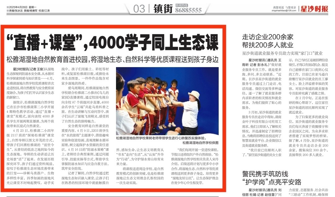 星沙时报4月27日讯(记者 王俊)从湿地生态探秘到防溺水安全课,从水循环科学探索到爱鸟知识普及……4月,松雅湖湿地自然学校优质课程首次走进校园,将自然教育与安全教育深度融合,为孩子们打开认识家乡生态的新窗口。