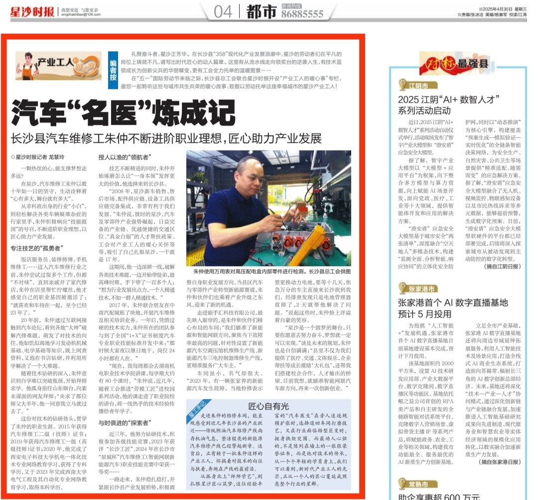 走进朱仲的维修车间,能直观感受到近几年长沙县的产业跃迁——传统燃油汽车维修产线尚存机油气息,整洁锃亮的新能源汽车维修产线已经擎起新章。这背后,正有赖于一批朱仲这样的产业工人,怀揣着对技术的向往与执着,奔跑在产线的最前沿。