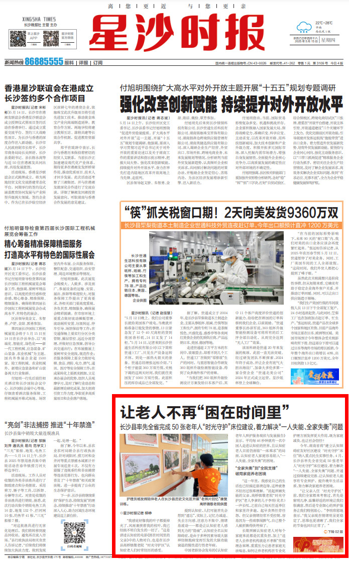 今年,湖南省将“建立认知障碍症友好社区建设‘时光守护’床位”纳入重点民生实事任务。4月,长沙县率先全省完成50张老年人“时光守护”床位建设,着力解决“一人失能、全家失衡”问题,并通过持续建设完善,让认知症老人能享有专业照护,提升晚年生活品质,努力解决家庭养老困境。