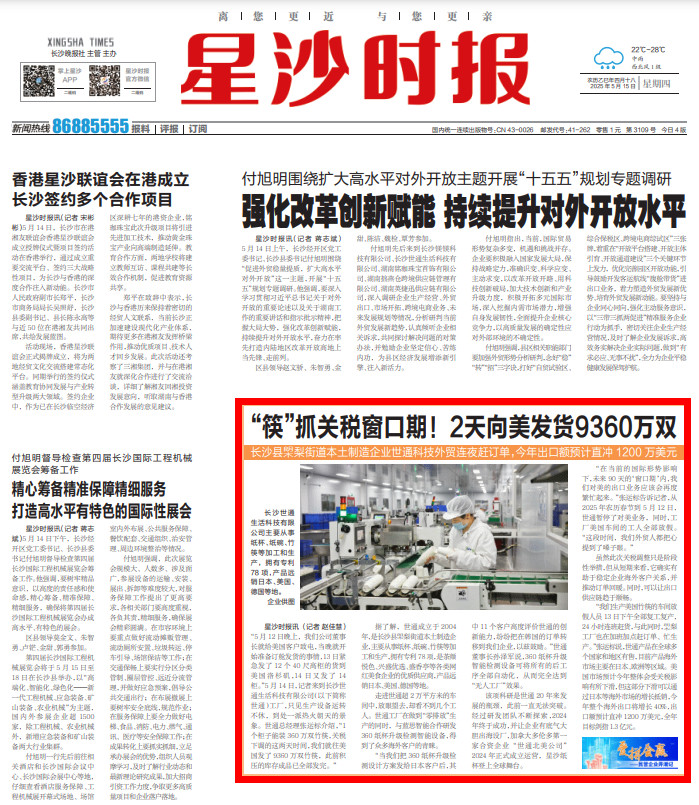 星沙时报5月14日讯(记者 赵佳慧)“5月12日晚上,我们公司董事长就给美国客户致电,当晚就开始准备订舱发货的事情,13日紧急发了12个40尺高柜的货到美国洛杉矶,14日又发了14柜。”5月14日,记者来到长沙世通生活科技有限公司(以下简称世通)工厂,只见生产设备运转不休,到处一派热火朝天的景象。世通总经理张运标介绍,“1个柜子能装360万双竹筷,关税下调的这两天时间,我们就往美国发了9360万双竹筷,此前积压的库存成品已全部发完。”