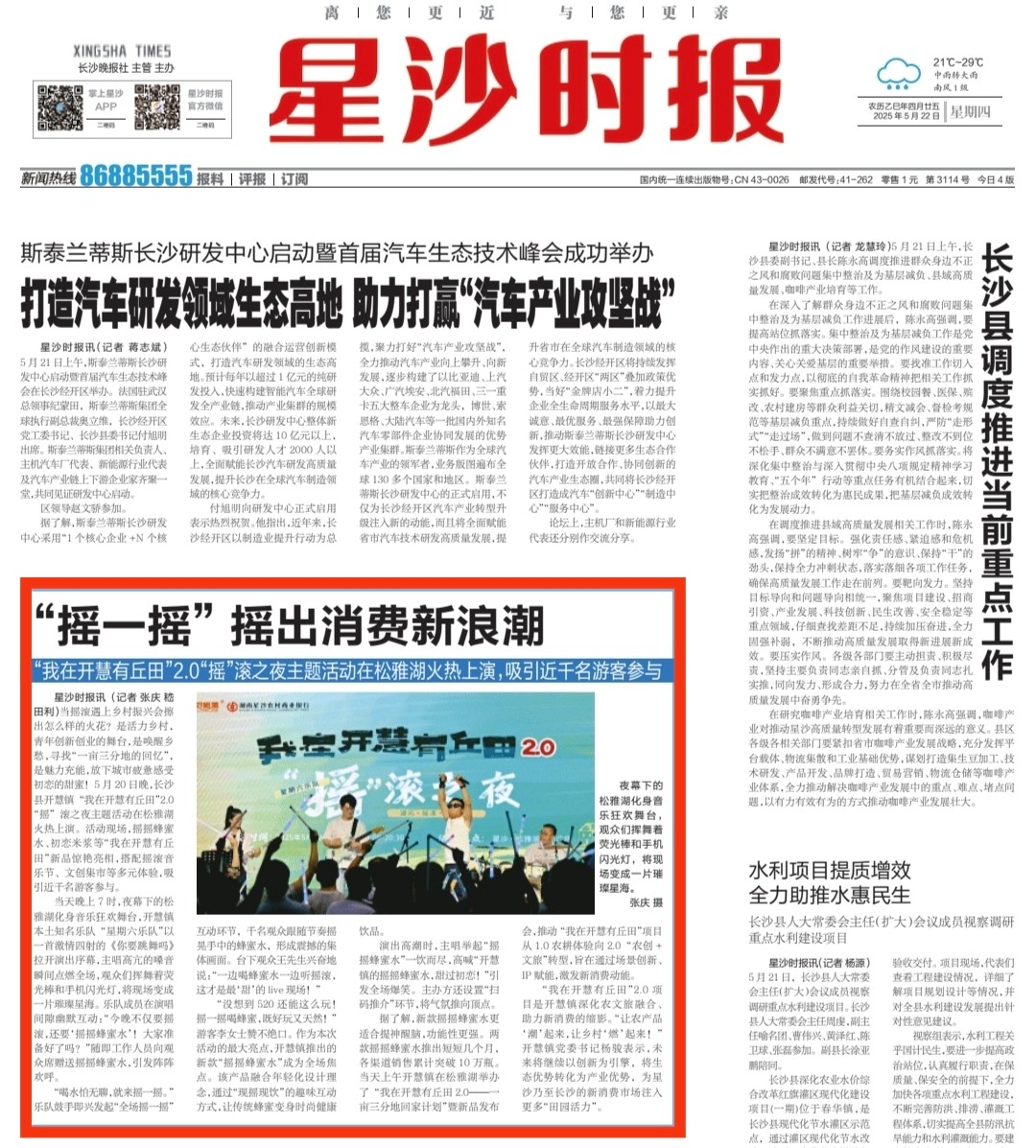 据了解,新款摇摇蜂蜜水更适合提神醒脑,功能性更强。两款摇摇蜂蜜水推出短短几个月,各渠道销售累计突破10万瓶。当天上午开慧镇在松雅湖举办了“我在开慧有丘田2.0——一亩三分地回家计划”暨新品发布会,推动 “我在开慧有丘田”项目从1.0农耕体验向2.0“农创+文旅”转型,旨在通过场景创新、IP赋能,激发新消费动能。