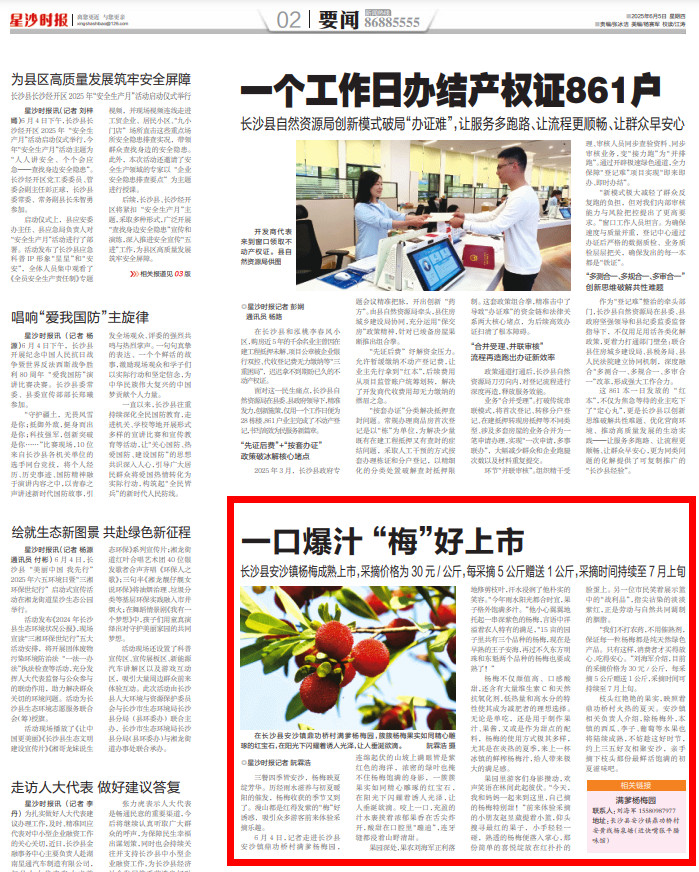 长沙县安沙镇杨梅成熟上市,采摘价格为30元/公斤,每采摘5公斤赠送1公斤,采摘时间持续至7月上旬