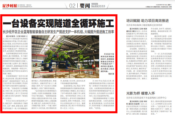 长沙经开区企业蓝海智能装备自主研发生产掘进支护一体机组,大幅提升掘进施工效率