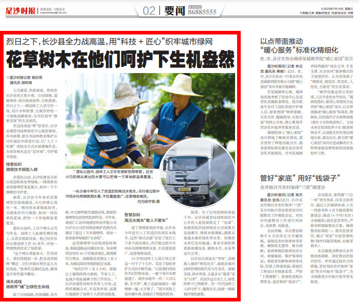 七月盛夏,热浪滚滚。然而在长沙县的大街小巷、公园绿地、道路两旁,依旧绿意盎然、生机勃勃。烈日之下,一群园林工人坚守在一线,用汗水和智慧,为城市的每一寸绿地浇灌清凉,为市民筑牢“推窗见绿”的生态底色。