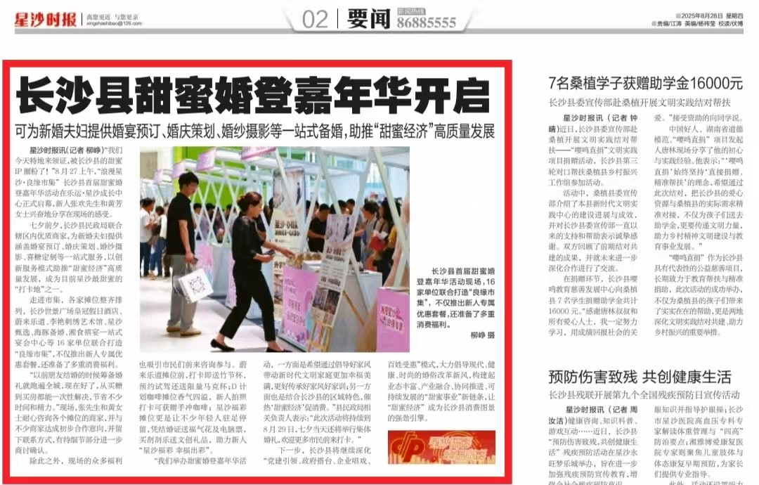 下一步,长沙县将继续深化“党建引领、政府搭台、企业唱戏、百姓受惠”模式,大力倡导现代、健康、时尚的婚俗改革新风,构建起业态丰富、产业融合、协同推进、可持续发展的“甜蜜事业”新链条,让“甜蜜经济”成为长沙县消费图景的强劲引擎。