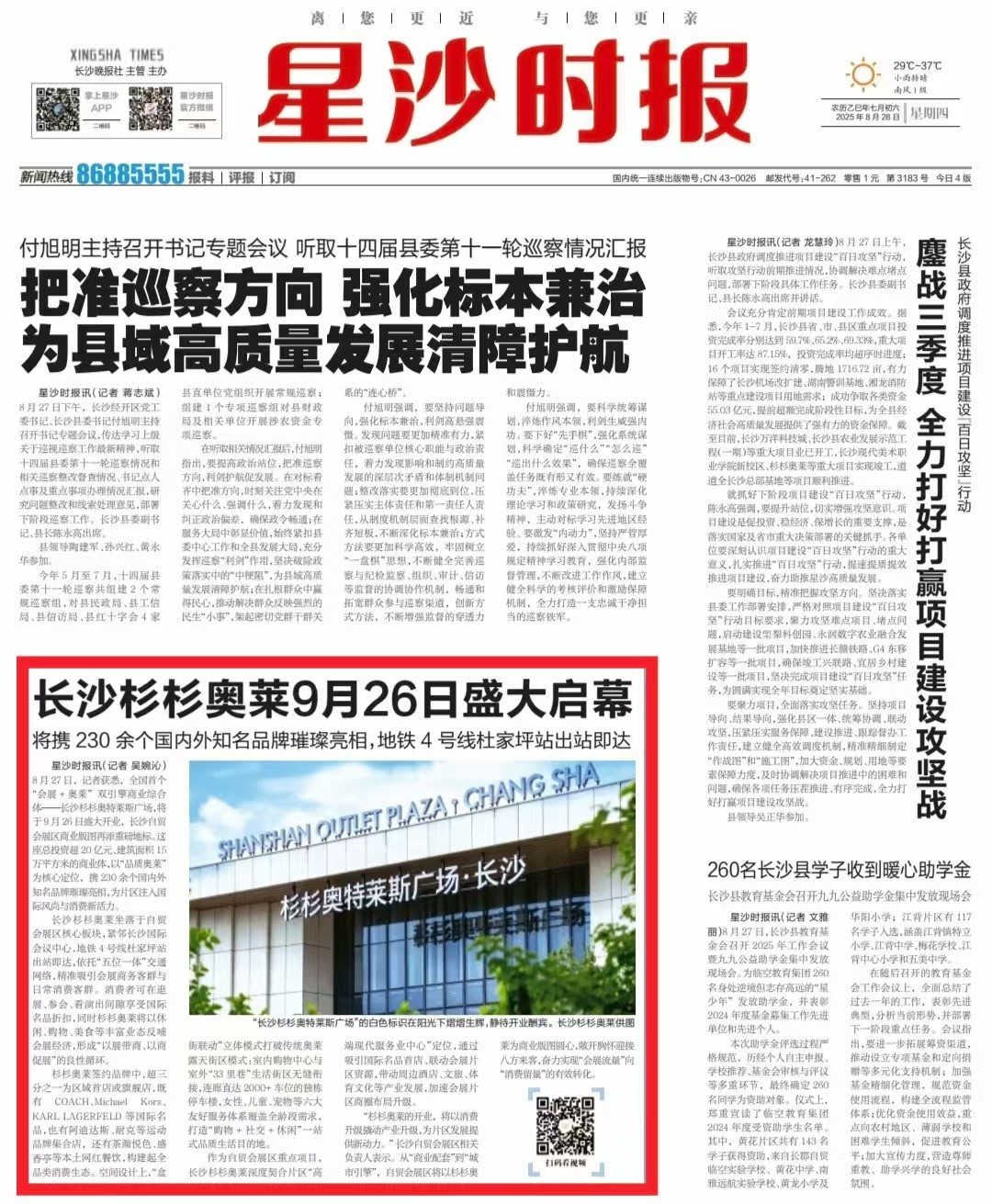 星沙时报8月27日讯(记者 吴婉沁)8月27日,记者获悉,全国首个“会展+奥莱”双引擎商业综合体——长沙杉杉奥特莱斯广场,将于9月26日盛大开业,长沙自贸会展区商业版图再添重磅地标。这座总投资超20亿元、建筑面积15万平方米的商业体,以“品质奥莱”为核心定位,携230余个国内外知名品牌璀璨亮相,为片区注入国际风尚与消费新活力。