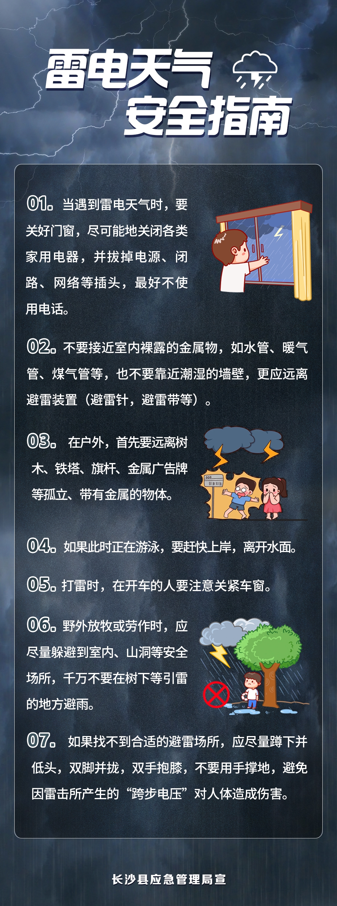 长沙县应急管理局、长沙县气象局提醒:雷雨大风天气具有突发性强、风力大且伴随雷电的特点,易引发树木倒伏、广告牌坠落、触电等危险,因此 “躲” 是保障安全的第一要务,民众需牢记相关避险要点:收到气象部门发布的预警时,应提前响应,取消郊游、露营、高空作业等户外计划,尤其避免在空旷地带、山区、水域附近逗留;若户外突遇该天气,要快速避险,远离大树、电线杆、广告牌、围墙、临时工棚、不坚固建筑等 “高危物体”,扔掉手中的金属物品以降低被雷击风险,优先躲进坚固的室内建筑并远离门窗和电器,同时避免蹚水以防触电,还要防范风力冲击,用衣物或背包护住头部向背风处移动,骑行者需立即下车推车至安全处;在室内时,则要做好 “三防范”,即防范雷击入户、物品坠落(需检查并加固阳台和窗外的花盆、空调外机等物品,防止砸伤楼下行人)以及次生内涝,做到不侥幸、不冒险,最大限度保障自身安全。