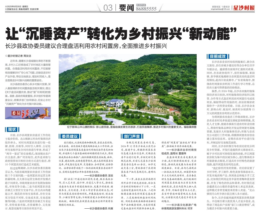 长沙县政协委员心系乡村振兴发展,深入基层调研农村闲置房盘活相关情况,提出《关于盘活闲置农房,推动“屋”尽其用》的提案。县委、县政府高度重视,多次组织专题调度会议,统筹多部门协同联动,切实让农村“沉睡资产”转化为乡村振兴新动能。