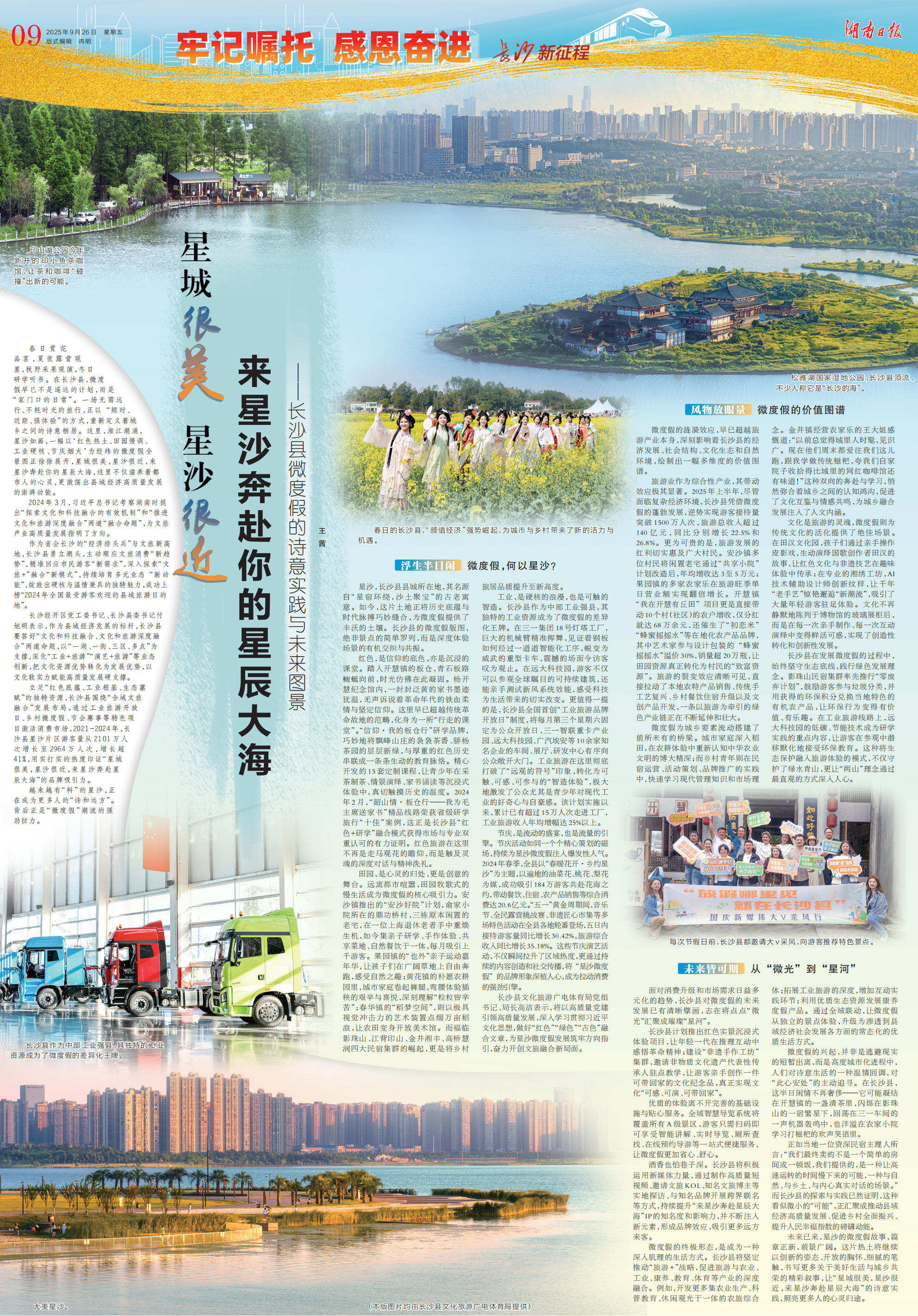 编者按:今日,《湖南日报》09版推出报道《 星城很美 星沙很近 来星沙奔赴你的星辰大海》,聚焦长沙县微度假的诗意实践与未来图景,描绘了一幅以“红色热土、田园慢调、工业硬核、节庆烟火”为经纬的微度假全景图。现将全文予以转发。