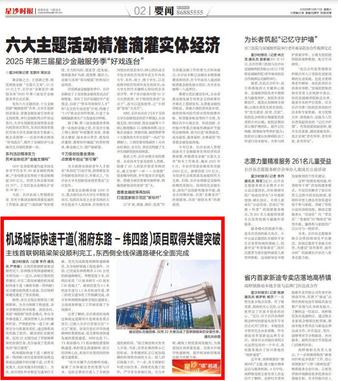 “项目关键节点的顺利突破,凝聚了全体建设者的智慧与汗水,也标志着项目进入了全面加速的新阶段。”临空集团相关负责人介绍,当前,攻坚克难的势头已经形成,各参建团队正以更加饱满的热情和昂扬的斗志,投入到后续施工中。下一步,各方将紧盯年度目标任务,持续优化施工组织,严守安全质量红线,全力冲刺,确保工程优质高效履约,为推进园区高质量发展、完善长沙城市快速路网、提升机场枢纽集疏运能力贡献力量。