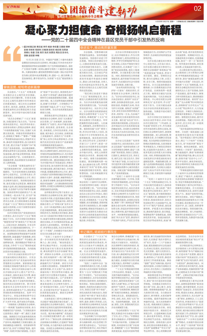 在党的二十届四中全会胜利闭幕之际,我倍感自豪、深受启发、更觉使命光荣!全会提出,加大保障和改善民生力度,扎实推进全体人民共同富裕。作为全域在长沙经开区的街道,泉塘街道将深学笃行习近平总书记的重要讲话和全会精神,围绕“服务园区提标、城市建管提质、社会治理提效”发展定位,在优化营商环境、增进民生福祉、推动基层治理上持续用力,充分发挥“泉+服”驿站、泉塘商会、工人文化宫的作用,积极培育壮大“旅游+”、低空经济等新兴产业;扎实推进老旧小区改造、闲置地块活化利用、城乡接合部综合整治等城市更新工作;持续用好“泉民连线 服务为民”平台,深入探索“泉联共治”“十分钟应急救援圈”等模式,全面提升基层治理水平,以实际行动践行“三高四新”战略定位和使命任务,为谱写中国式现代化湖南篇章贡献泉塘力量!