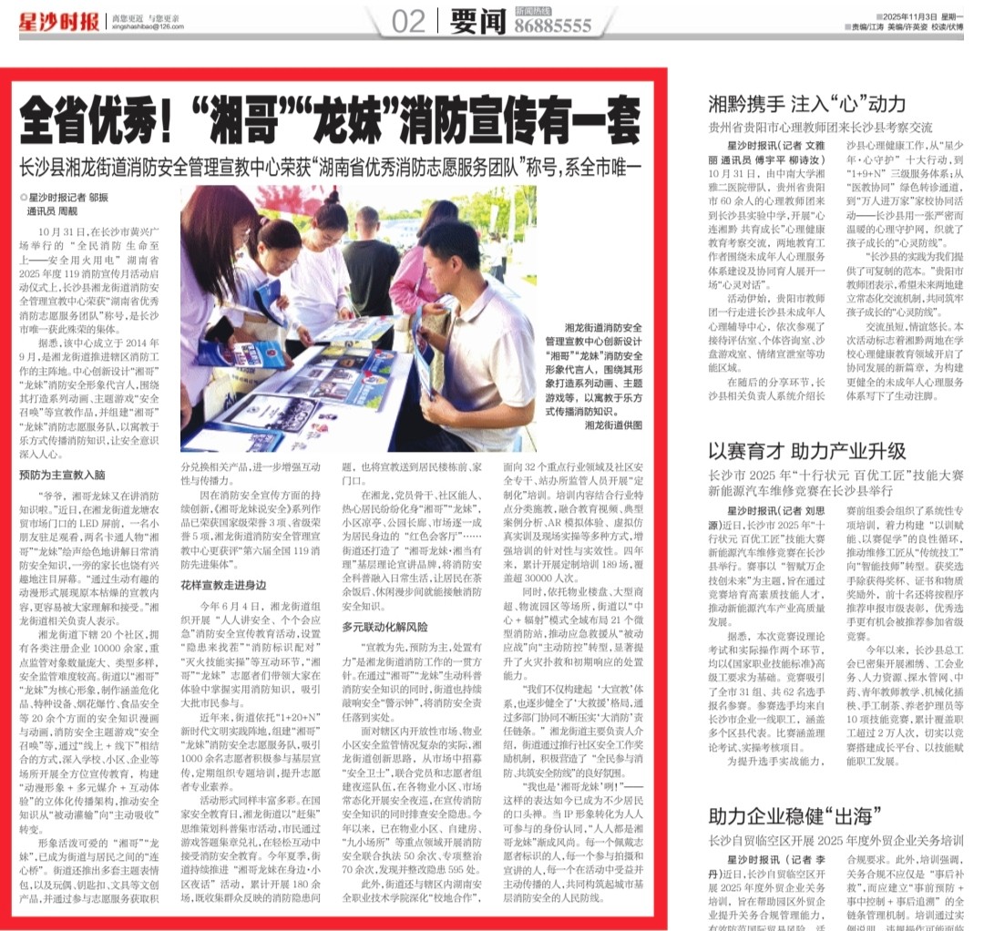 10月31日,在长沙市黄兴广场举行的“全民消防 生命至上——安全用火用电”湖南省2025年度119消防宣传月活动启动仪式上,长沙县湘龙街道消防安全管理宣教中心荣获“湖南省优秀消防志愿服务团队”称号,是长沙市唯一获此殊荣的集体。
