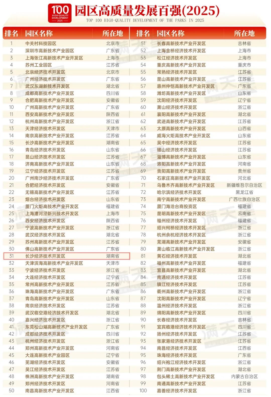 星沙时报11月3日讯(记者 周浩然)近日,国内知名咨询机构赛迪顾问发布《2025年中国园区经济高质量发展研究》,公布了全国园区高质量发展百强(2025)、全国园区产业质量发展百强(先进制造)等名单。长沙经开区表现亮眼,在全国园区高质量发展百强(2025)中排名第31位,较去年提升了4位;在全国园区产业质量发展百强(先进制造)中,位列第22位,较去年也提升了4位,彰显出强劲的产业竞争力。