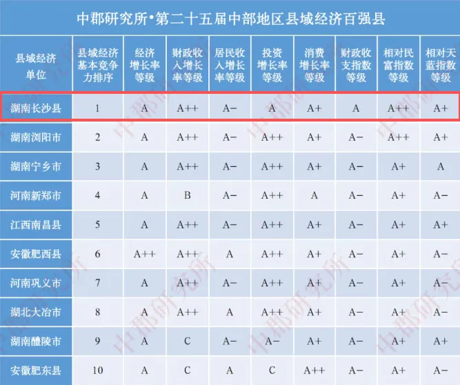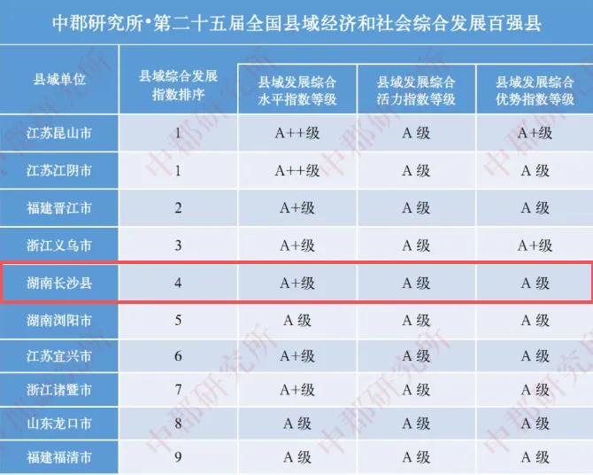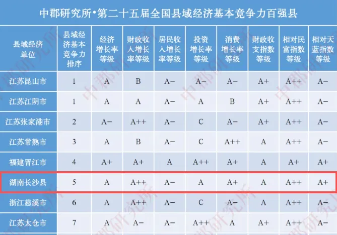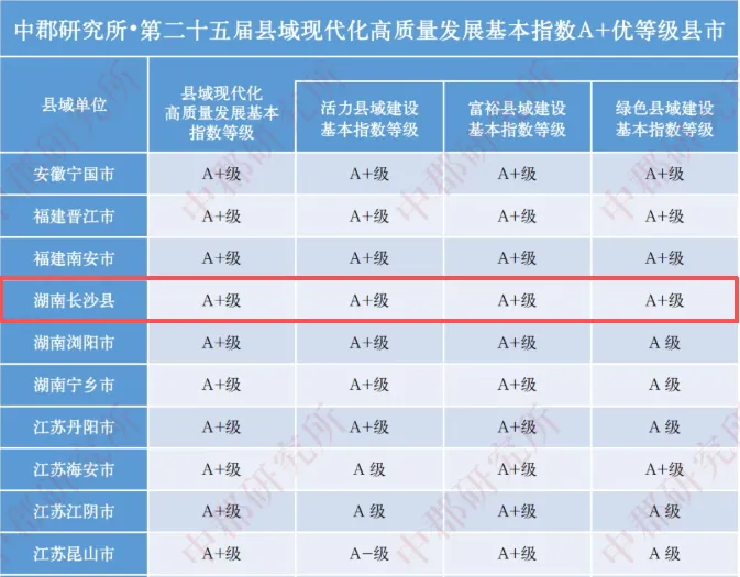 11月11日,中郡研究所发布《第二十五届县域经济与县域发展研究报告》,长沙县在全国县域经济基本竞争力百强县中位列第5,在全国县域经济和社会综合发展百强县中位列第4,获评县域现代化高质量发展基本指数A+优等级县市,在中部地区县域经济百强县中位列第1,各项指数持续领跑中西部。
