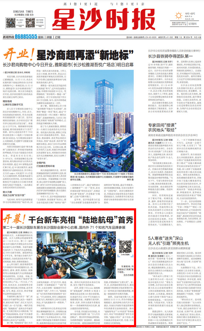 星沙时报12月10日(记者 吴婉沁)从陆地到天空,从赛博越野到时尚超跑,从万人团购会到超级智驾会……12月10日,第二十一届中国(长沙)国际汽车博览会在长沙国际会展中心拉开帷幕。本届车展吸引国内外71个知名汽车品牌参展,近1000台新车亮相,展览面积达8万平方米,集中展示全球汽车产业智能化、自动化前沿技术和产品,实现观展、体验、消费深度融合。