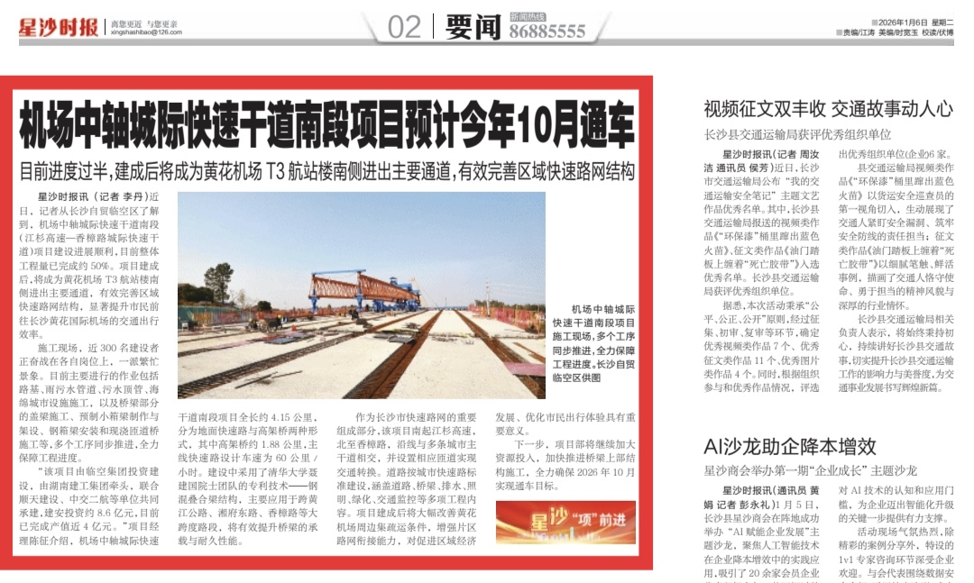 星沙时报1月4日讯(记者 李丹)近日,记者从长沙自贸临空区了解到,机场中轴城际快速干道南段(江杉高速—香樟路城际快速干道)项目建设进展顺利,目前整体工程量已完成约50%。项目建成后,将成为黄花机场T3航站楼南侧进出主要通道,有效完善区域快速路网结构,显著提升市民前往长沙黄花国际机场的交通出行效率。