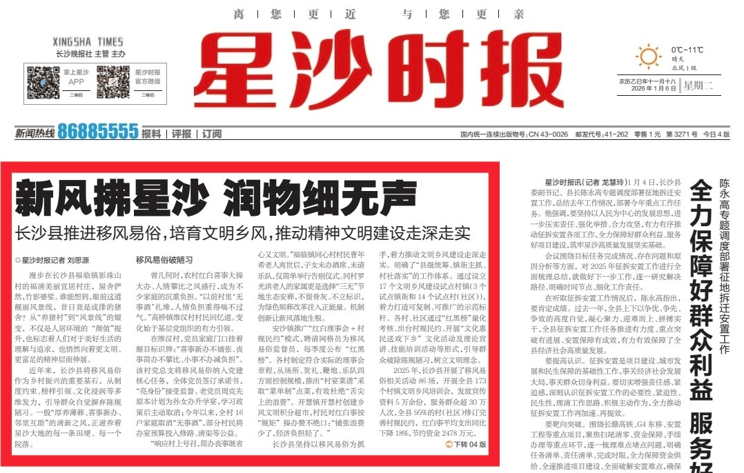 2025年,长沙县开展了移风易俗相关活动86场,开展全县173个村镇文明乡风培训会,发放宣传资料5万余份,服务群众超30万人次,全县95%的村(社区)修订完善村规民约,红白事平均支出同比下降18%,节约资金2478万元。