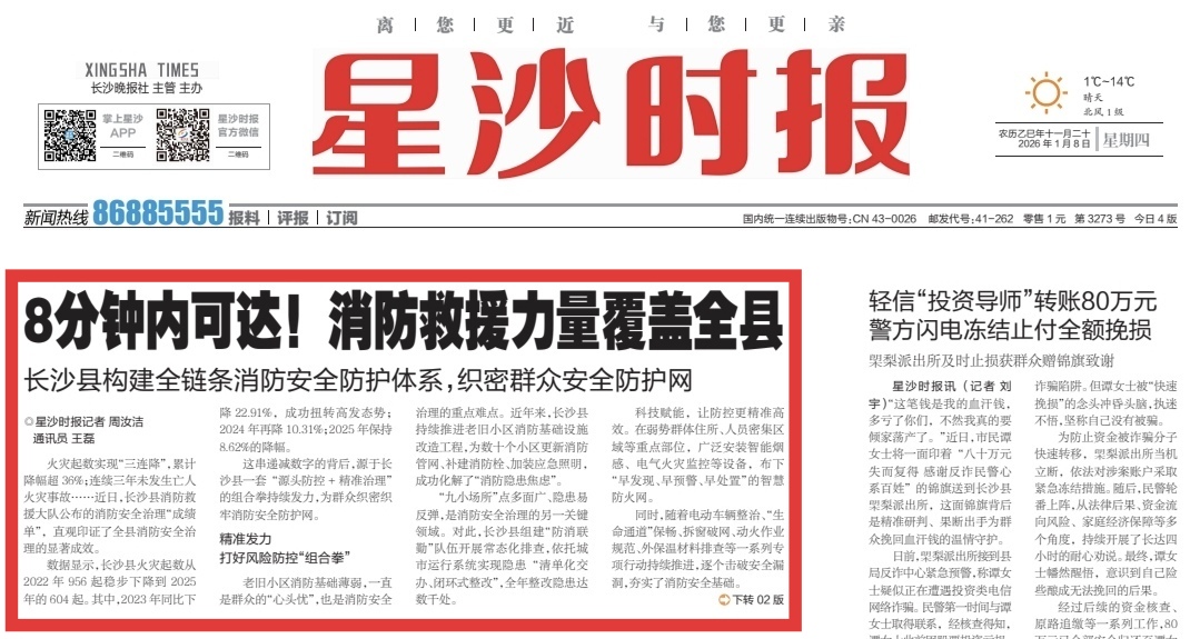 火灾起数实现“三连降”,累计降幅超36%;连续三年未发生亡人火灾事故……近日,长沙县消防救援大队公布的消防安全治理“成绩单”,直观印证了全县消防安全治理的显著成效。