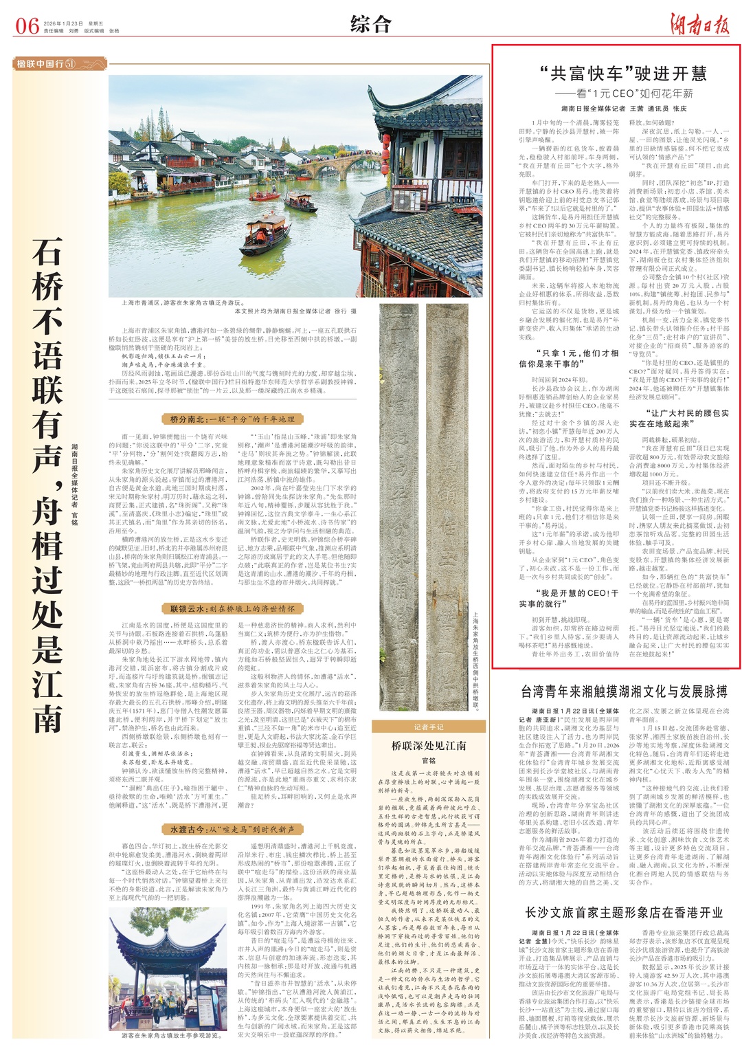 编者按:《湖南日报》2026年1月23日06版刊发报道《“共富快车”驶进开慧——看“1元CEO”如何花年薪》,介绍乡村CEO易丹深耕长沙县开慧镇,打造田园消费新场景,激活乡村振兴“一池春水”。现予以全文转发。