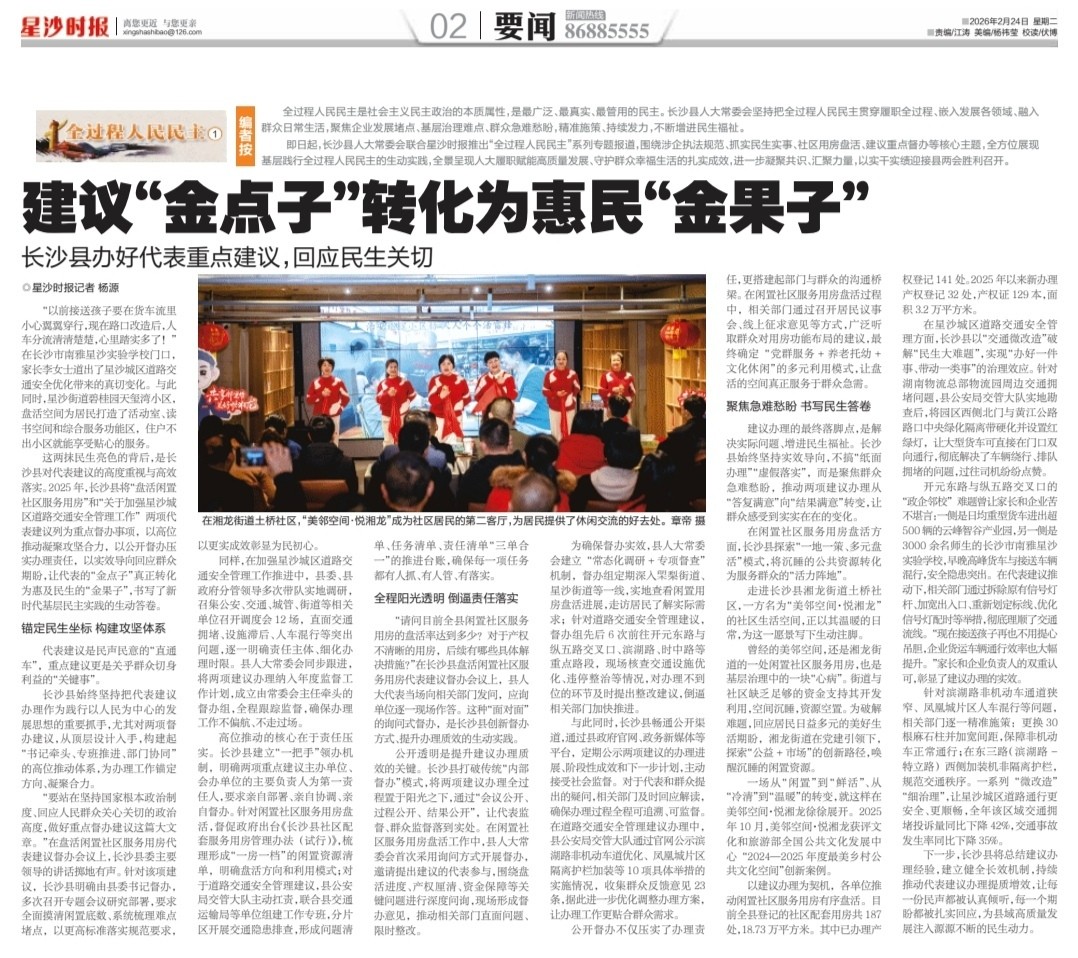 这两抹民生亮色的背后,是长沙县对代表建议的高度重视与高效落实。2025年,长沙县将“盘活闲置社区服务用房”和“关于加强星沙城区道路交通安全管理工作”两项代表建议列为重点督办事项,以高位推动凝聚攻坚合力,以公开督办压实办理责任,以实效导向回应群众期盼,让代表的“金点子”真正转化为惠及民生的“金果子”,书写了新时代基层民主实践的生动答卷。