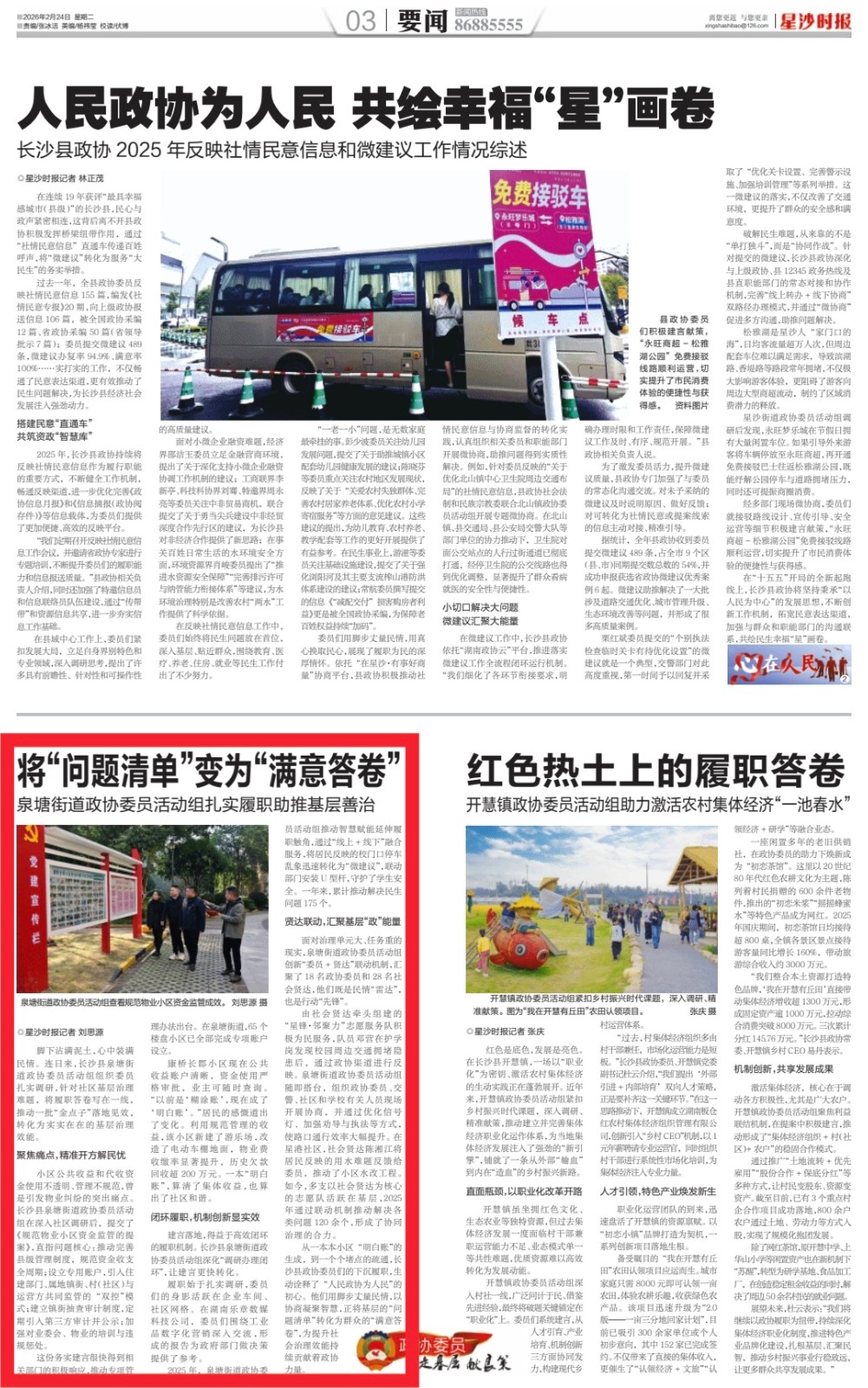 从一本本小区“明白账”的生成,到一个个堵点的疏通,长沙县政协委员们的下沉履职,生动诠释了“人民政协为人民”的初心。他们用脚步丈量民情,以协商凝聚智慧,正将基层的“问题清单”转化为群众的“满意答卷”,为提升社会治理效能持续贡献着政协力量。