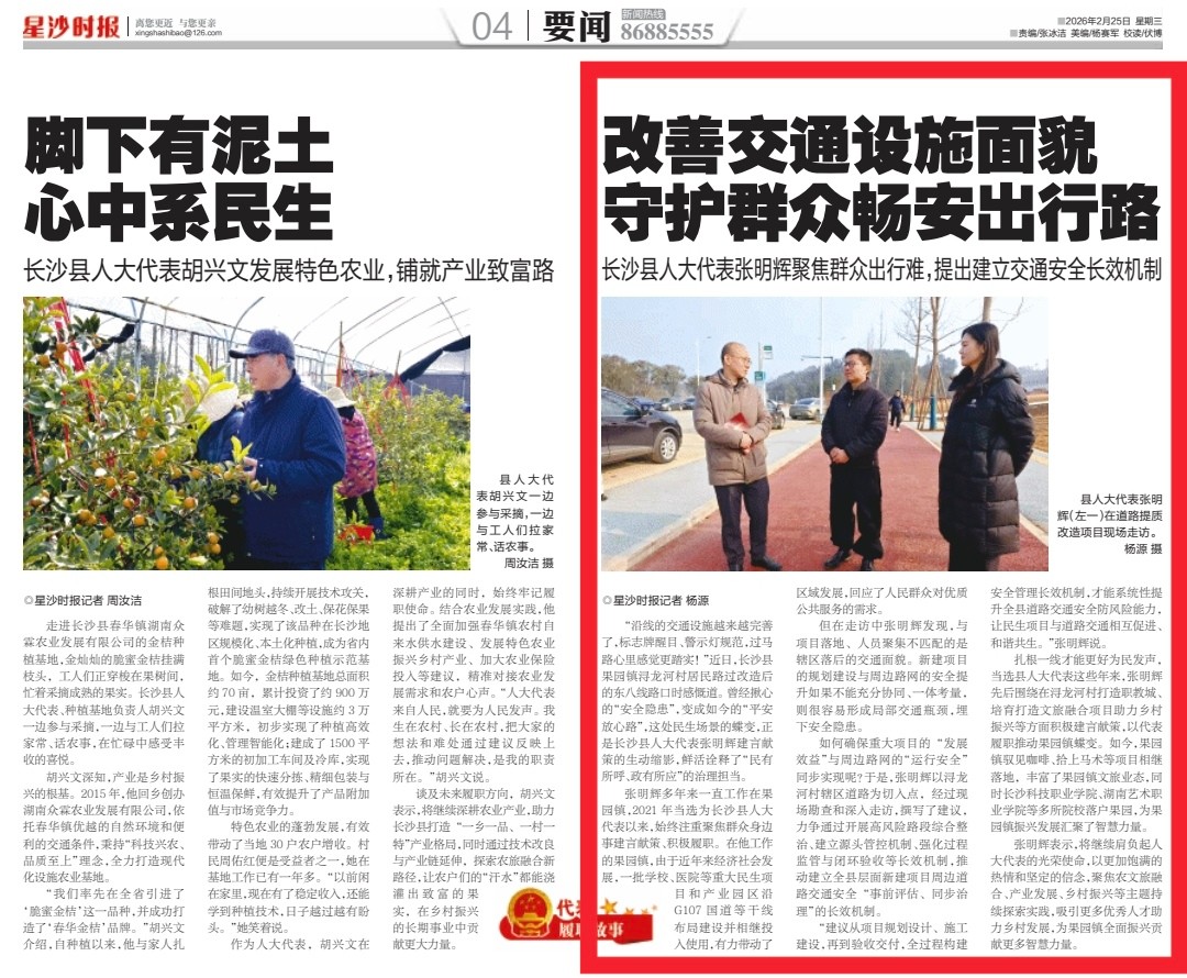 “沿线的交通设施越来越完善了,标志牌醒目、警示灯规范,过马路心里感觉更踏实!”近日,长沙县果园镇浔龙河村居民路过改造后的东八线路口时感慨道。曾经揪心的“安全隐患”,变成如今的“平安放心路”,这处民生场景的蝶变,正是长沙县人大代表张明辉建言献策的生动缩影,鲜活诠释了“民有所呼、政有所应”的治理担当。